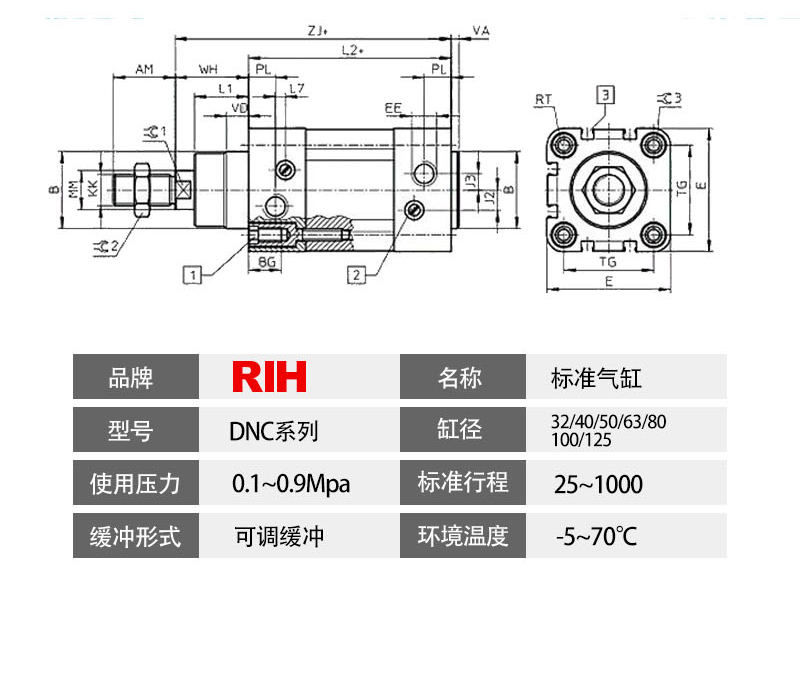 DNC標準氣缸密封圈采用兩個Y型單向密封結構,有補償功能,壽命長,啟動壓力低。為方形缸筒,無拉桿,防腐蝕性能好,氣缸有緩沖調節,多種規格的氣缸及安裝附件可供客戶選擇