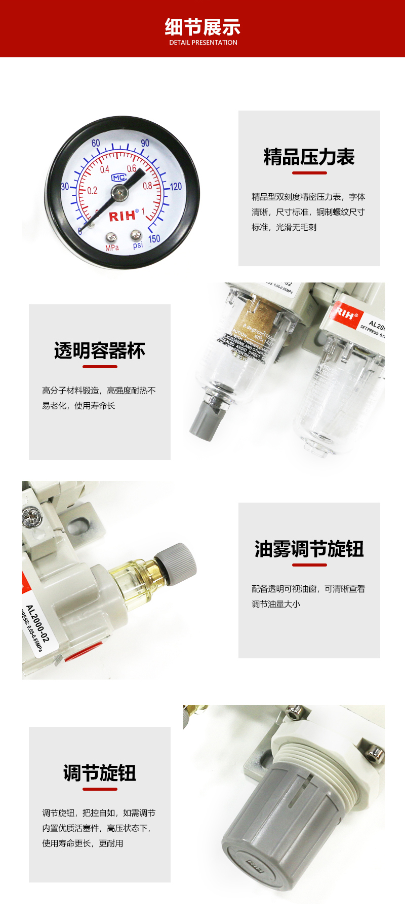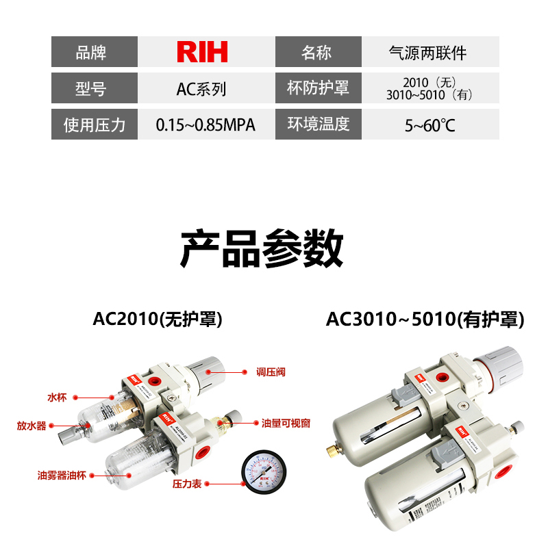 SMC氣動二聯件AC2010-02由調壓過濾器和油霧器構成,他的功能和三聯件是一樣的,公司生產的SMC氣動二聯件能夠完全代替SMC二聯件,結構輕巧緊湊,安裝使用方便;壓力損失小,分水效率高;透明是視察罩,可直接觀察滴油量大小;瑞亨提供最全面的氣源處理選型、銷售服務一體式,服務于自動化氣動行業配套與解決方案是我們不變宗旨。