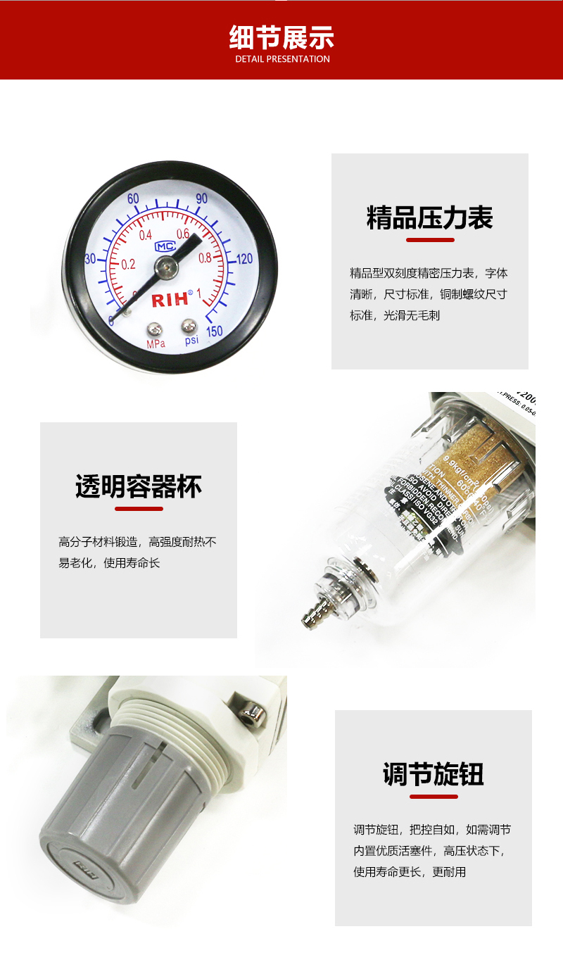 SMC型調壓過濾器AW2000-02,結構輕型緊湊,安裝使用方便,壓入式自鎖機構,可防止調定壓力受外界干擾而產生異動;壓力損失小,分水效率高;透明視察罩,可直接觀察滴油量大小;瑞亨所生產的調壓過濾器能夠完全代替SMC調壓過濾器,提供最全面的型號選型和報價銷售服務。